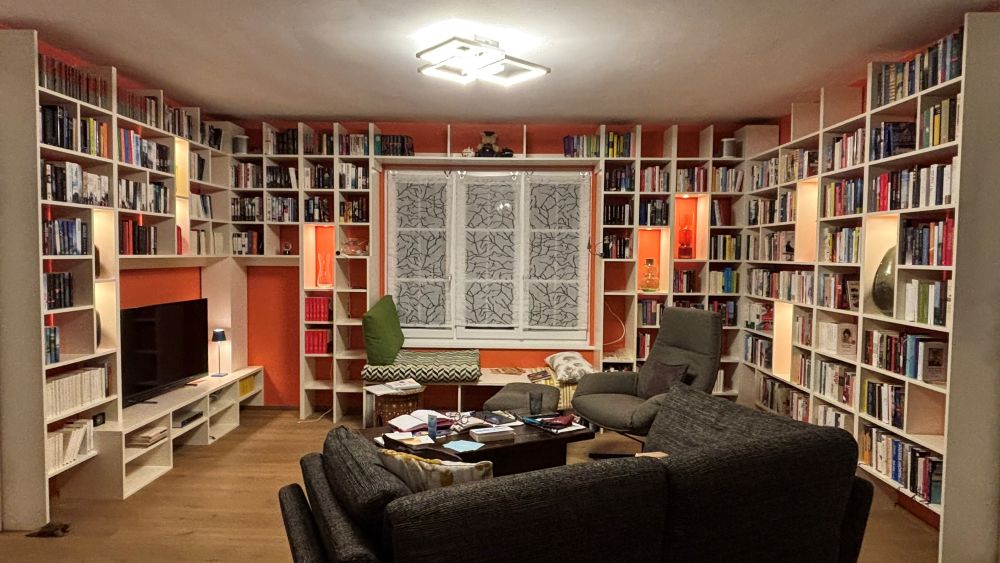 Und deine Bücherwand sieht toll aus, super gemütlich.